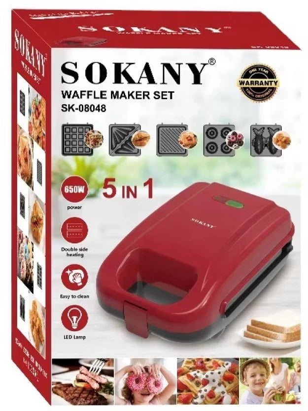 Sokany SK-08048 5-in-1 Electric Waffle Maker – Interchangeable Non-Stick Plates, 650W, Red