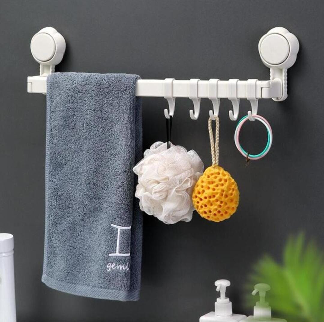 This wall-mounted sucker hanging rod offers convenient storage with a secure, tool-free installation. Designed using suction-based mounting technology, it adheres firmly to smooth surfaces such as tile or glass. The rod includes five hooks for hanging various items and features a design that promotes drainage and air circulation.